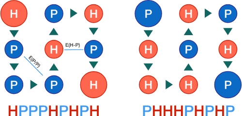 The above image contains two proteins and their corresponding random conformations based on a hydrophobic-polar protein folding model. The total energy of the proteins can be estimated by summing up the energy values for each type of interactions among the residues using the following rules: where the dashes represent the indirect linear (horizontal or vertical) interactions and the slashes represent the (left or right) diagonal interactions among the residues i.e. and For clarification, note that the directed interactions between two residues that are directly connected (as shown by arrows) do not play a part in the estimation of the total energy. Also, note that the interaction between a unique pair of residues can only be considered once. The two lines in the image are hints, not connections.